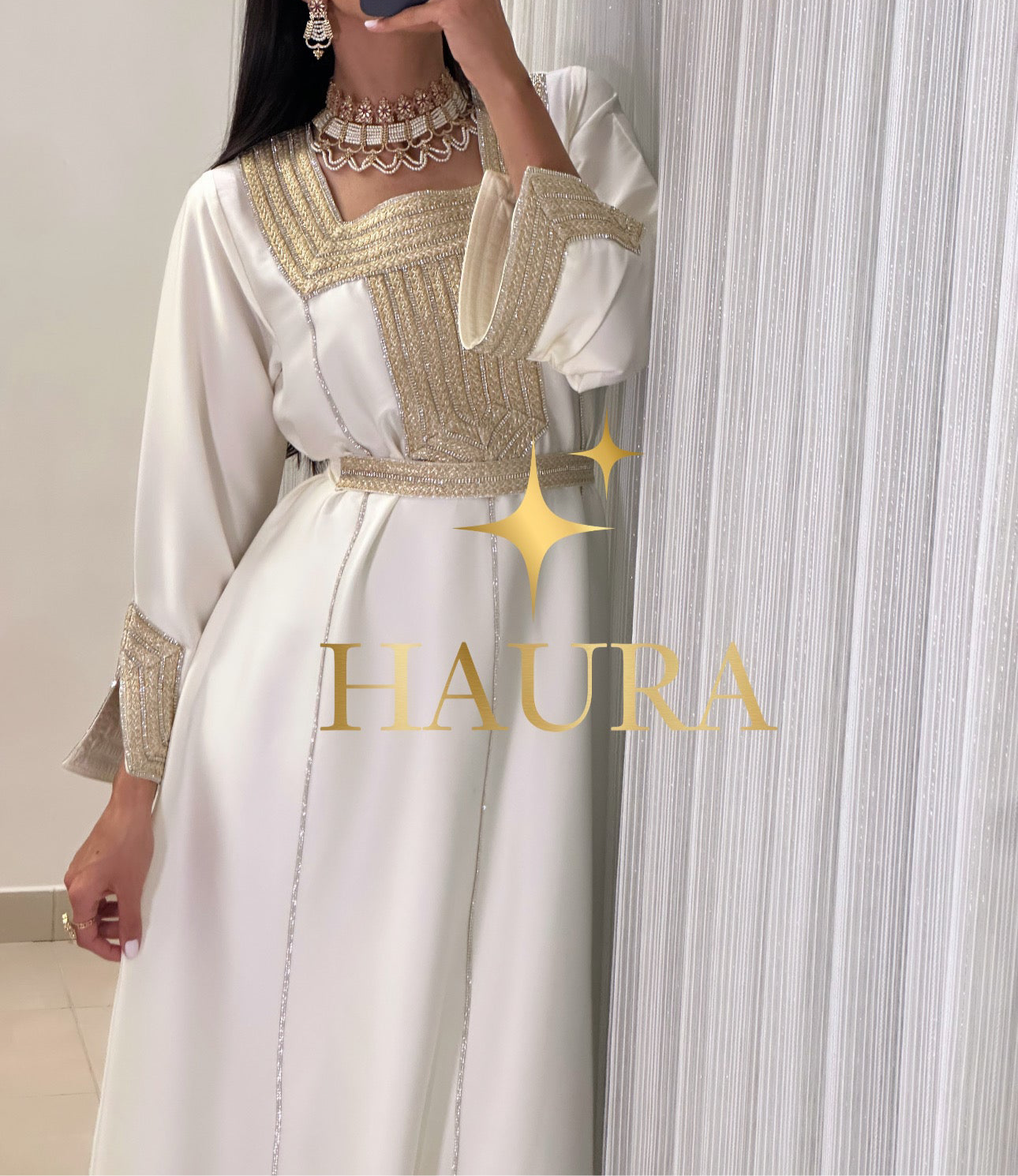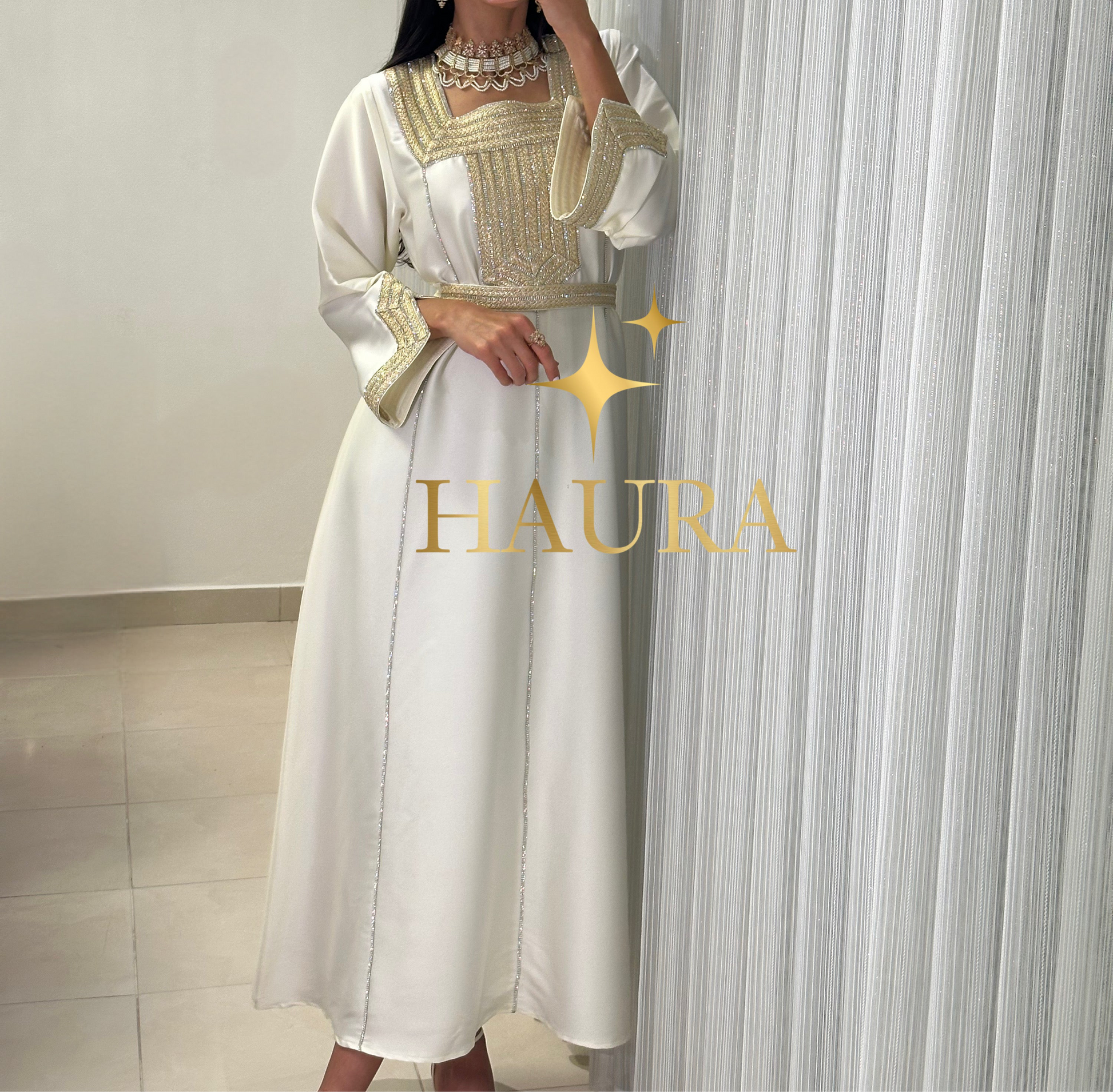 مزخرف بتفاصيل فضية فاخرة على الصدر والأكمام، تمنحه لمسة من الأصالة والتميّز المستوحاة من الذوق العربي الراقي.