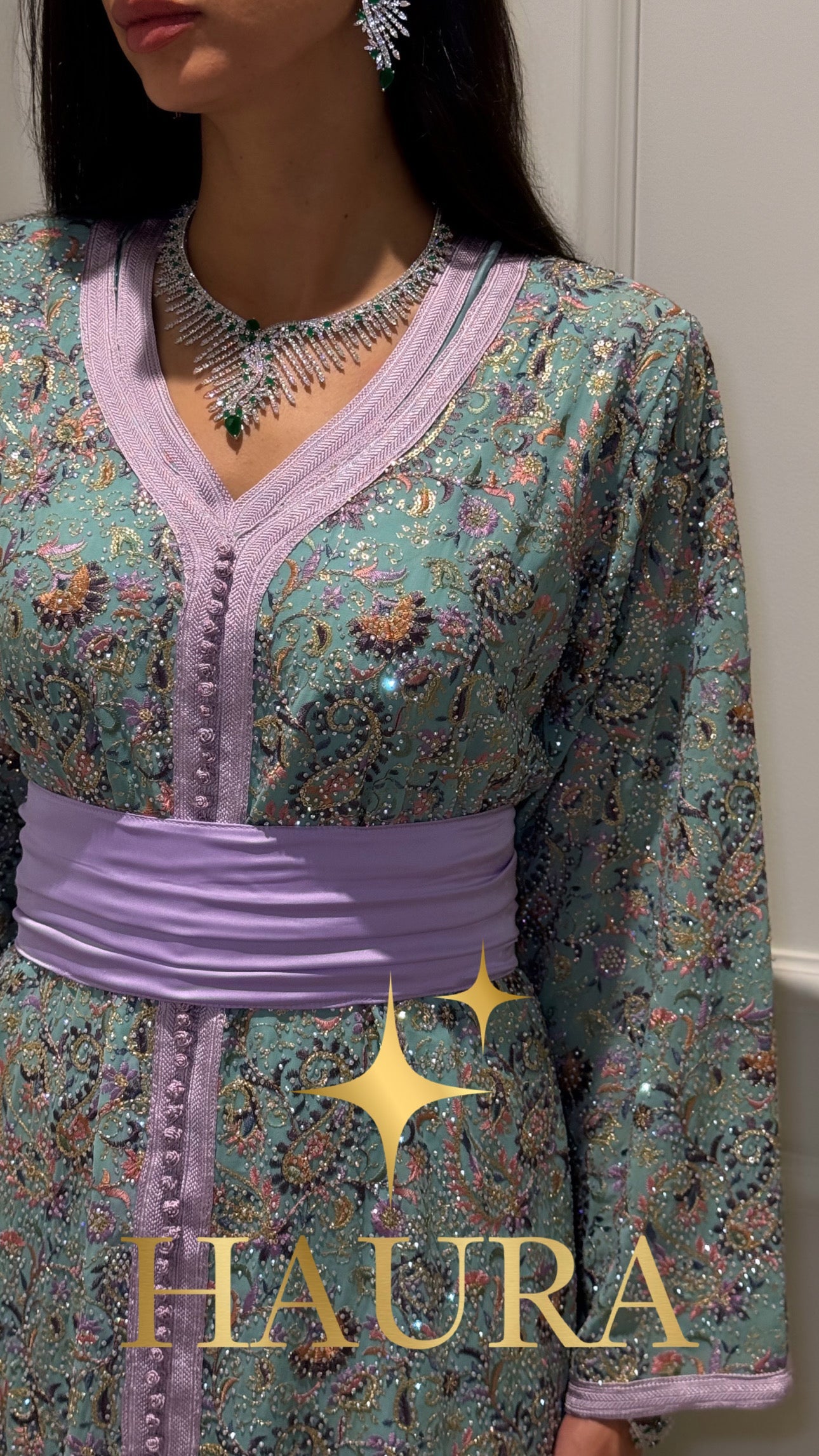 قفطان مغربي بتفاصيل ناعمة، مصنوع من قماش هندي فاخر حصري لـ HAURA.